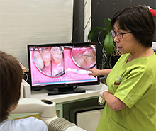 ADMENIC DVP2を導入する以前は、患者さんに口腔内の状態(歯石やプラークの沈着、カリエス、補綴物の不適合、歯肉の腫れなど)を説明し現状を把握してもらうため、本や写真などを交えて行っていましたが、自分の口腔内ではないため、完全に理解いただくのが難しいようでした。 例えば、ブラッシングの時の歯ブラシの当て方を手鏡で見て指導しても結果に結びつきにくい事が多く、特にお年寄りは視力が弱まり暗い口の中は見えづらいので何度も指導する事になり患者さんの負担になることもあります。