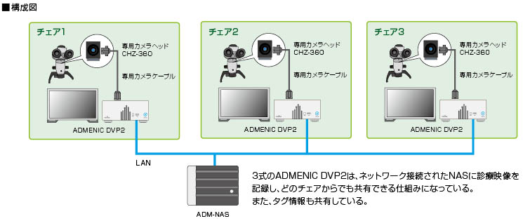 マイクロを導入後、治療内容を患者さん診療直後に見せたいとのことで、2016年3月、ADMENIC DVP2を導入頂きました。現在は、高﨑先生と歯科衛生士の方6人で3式のADMENIC DVP2を使いNASで診療データを共有する運用をされています。