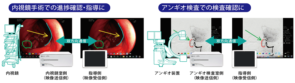 手術室の術野カメラや内視鏡、検査装置などの映像を、院内のタブレット端末でモニタリングできます。双方向で画面上への描画と会話が行えます。