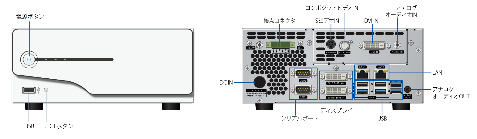 映像入力端子には、DVI、Sビデオ、コンポジット(BNC)端子を実装し、内視鏡やアンギオ装置等を接続できます。また、オーディオ入出力用にステレオミニジャックを備え、音声出力のON/OFF設定も可能です。