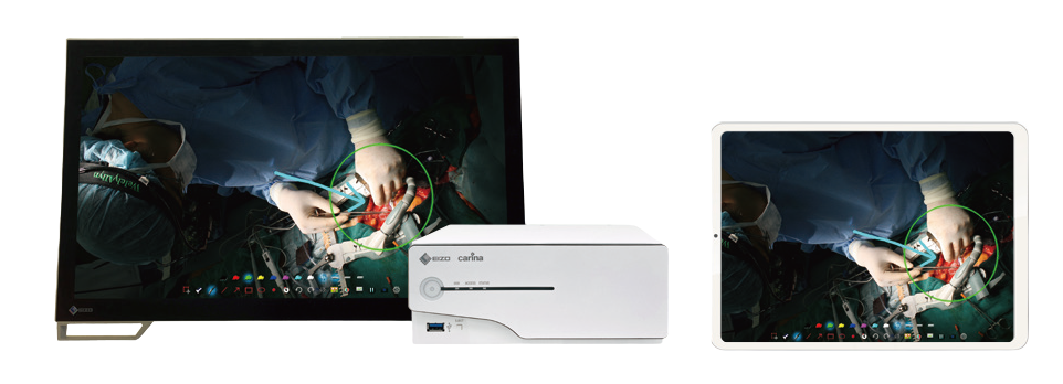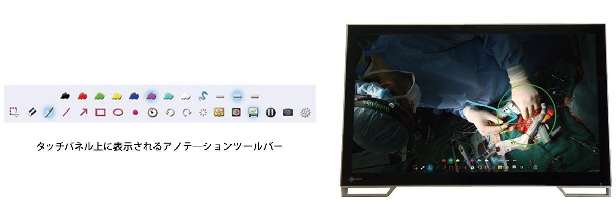 入力した術野カメラ等の映像上にタッチパネルを用いて自由な描画が可能なアノテーションシステムです。手術室や内視鏡室内の研修医に対して、医師が離れた場所から指導を行ったり、室外から学生の手術手技についての教育に活用でき、医療安全の質の向上に活用できます。