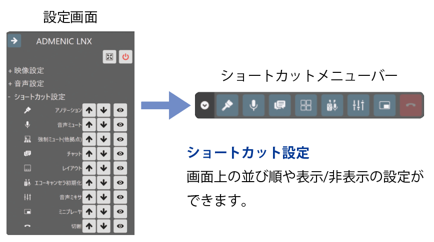 メイン画面上のショートカットメニューバーには、必要なボタンのみ配置でき、シンプルな操作が可能です。また、画面上の自由な位置に配置できます。