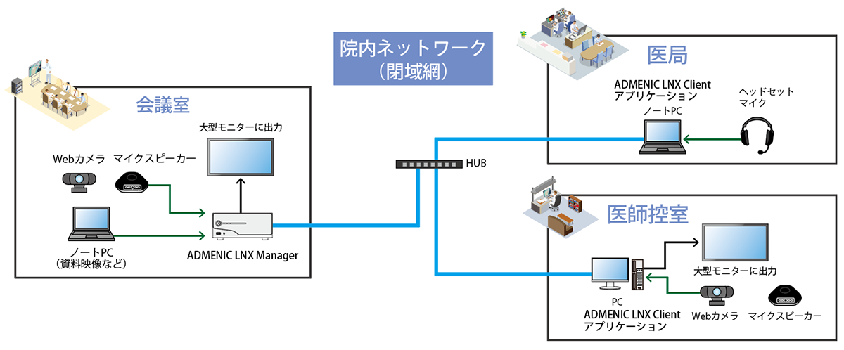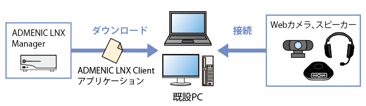院内で使用しているPCや電子カルテ端末などにADMENIC LNX Clientアプリケーションをインストールし、Webカメラとマイクスピーカーを接続すれば手軽にビデオ会議が行えます。