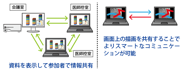 参加者のPC画面を共有し、それぞれの資料や画像を表示させてディスカッションが可能です。発言による説明に加え、描画機能を併用することで、より高効率な会議が行えます。