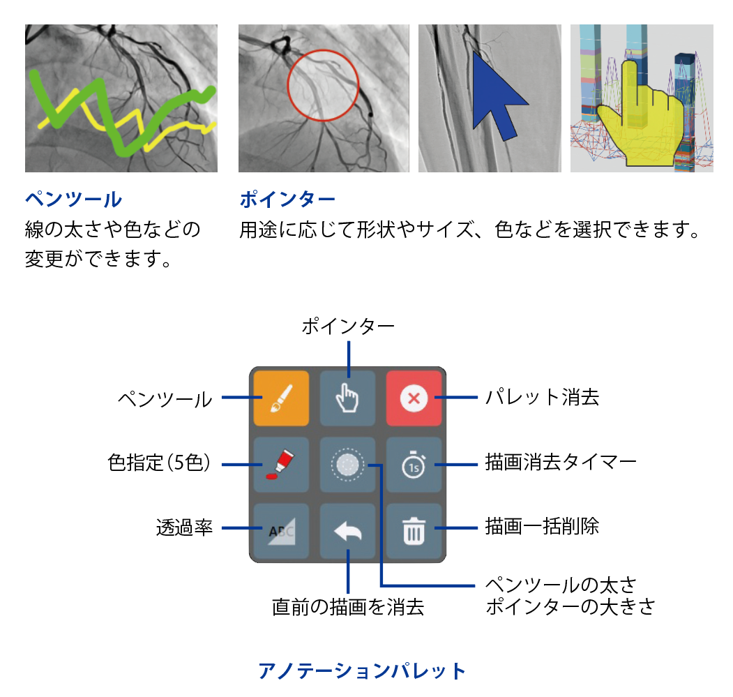 ペンツールを使用して、共有した画面上に双方向でストレスフリーなフリーハンドの描画が可能です。また、注視したい箇所を示すのに便利なポインターなど、便利な機能を用意しています。透過率の調整や自動消去の設定も可能です。