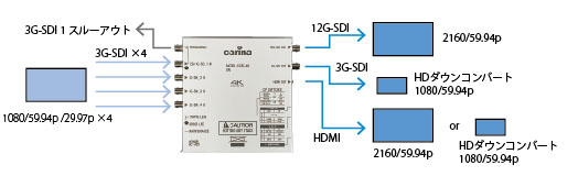 4K 3G-SDI×4出力を搭載した機器などの入力信号を12G-SDI、3G-SDI、HDMIのすべての出力端子から同時に出力できます。HDMIは4KもしくはダウンコンバートしたHDを選択できます。