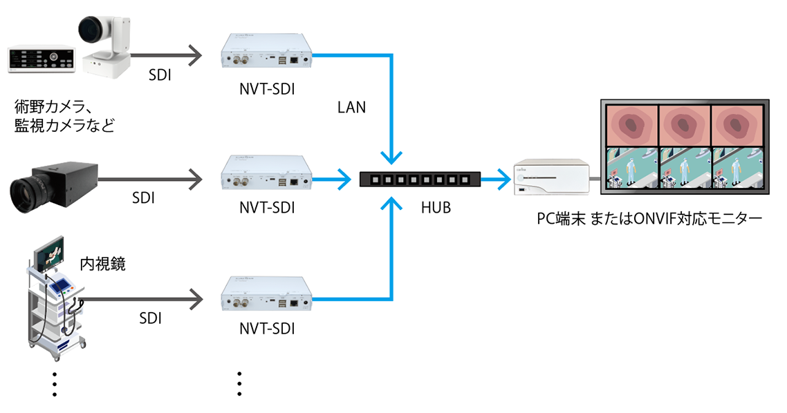 別売のWindows用ソフトウェア「NVT Viewer」を使用して、NVT-SDIを介してネットワーク配信した映像やネットワークカメラなどの映像をサーバーレスでマルチ表示する環境を構築することができます。