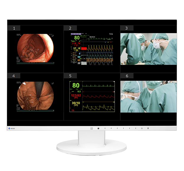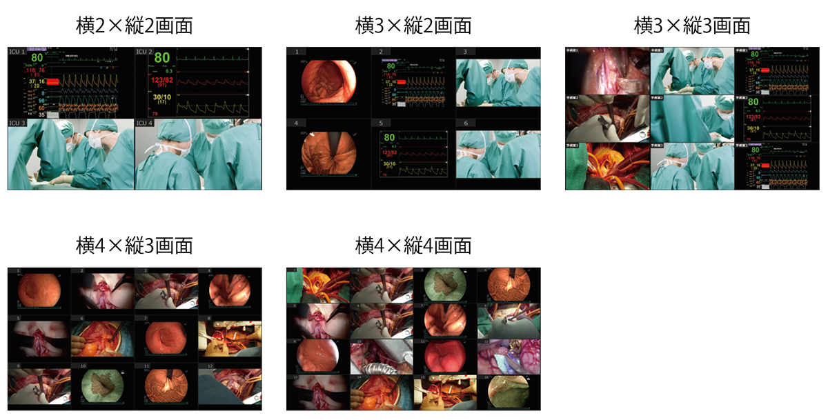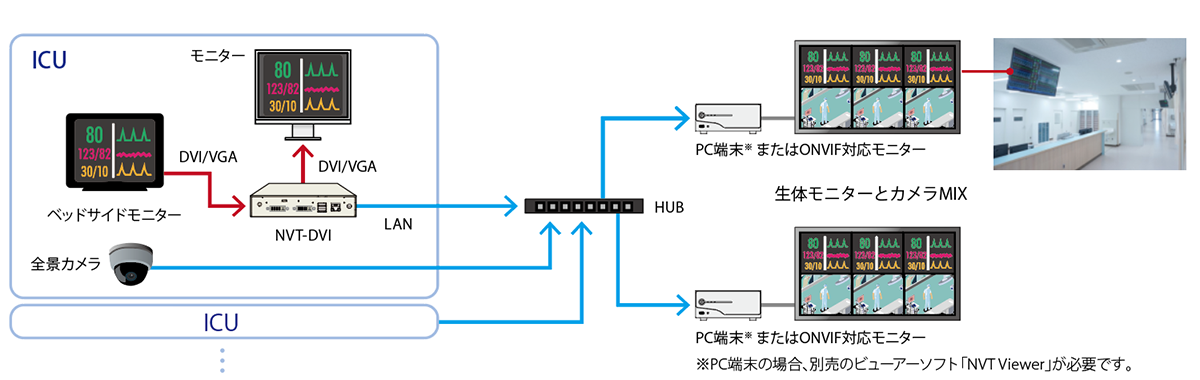 ICUのベッドサイドモニタとベッドごとの監視カメラ映像をスタッフステーションからマルチ映像で一括監視します。