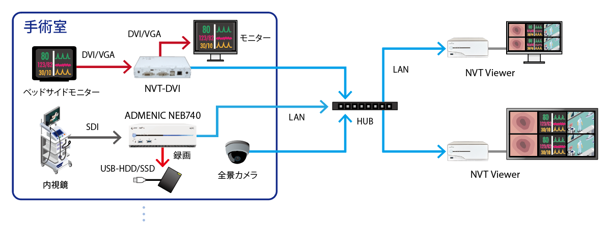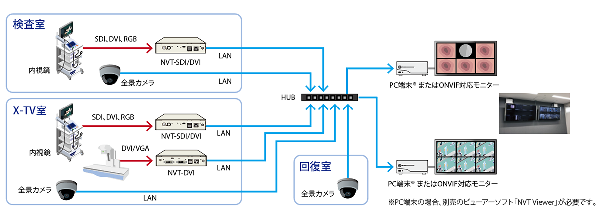 「NVT-SDI」、「NVT-DVI」のほか、当社製ネットワークエンコーダの配信映像をサーバーレスでマルチ表示できます。