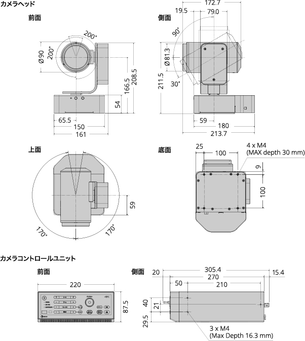 外形寸法 (突起部除く)カメラヘッド (ケーブルカバー装着時):161(W)×211.5(H)×213.7(D)mm