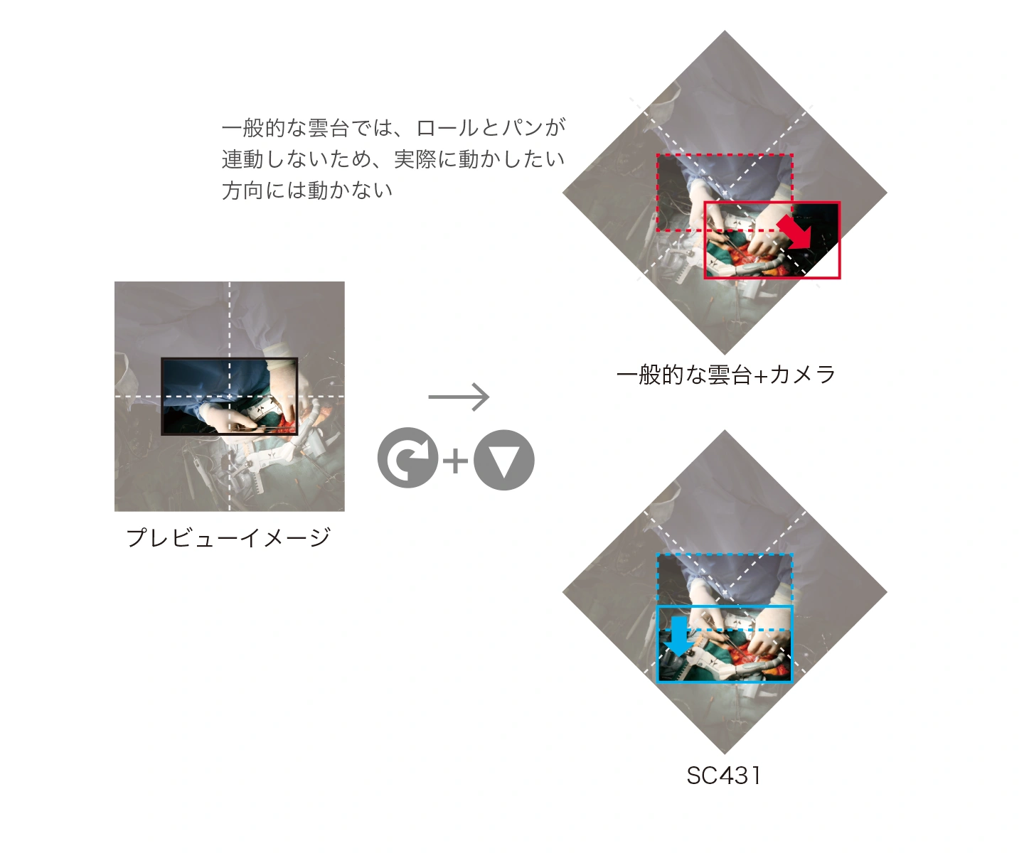 独自の制御プログラムにより、パンする時は雲台のロール位置等に関係なく、プレビュー映像を見ながら動かしたい方向に操作することができます。