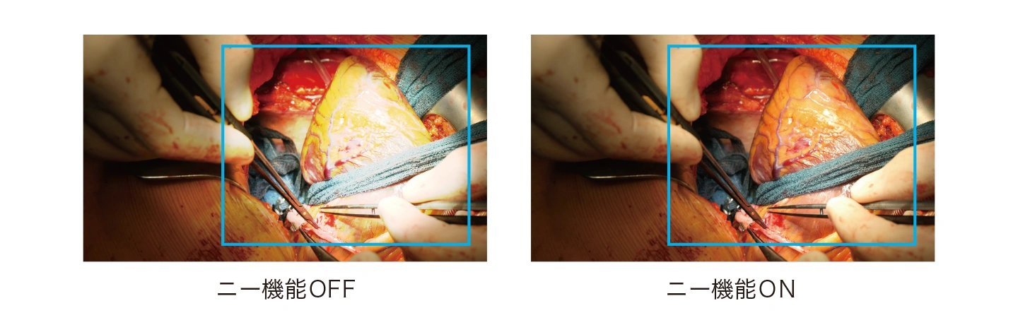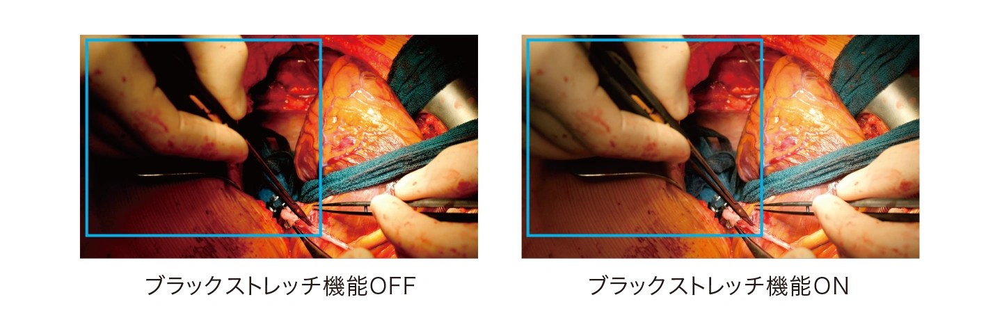 無影灯によるハレーションを軽減させる「ニー機能」と、暗部の視認性を向上する「ブラックストレッチ機能」、映像ノイズやざらつきを低減する「ノイズリダクション機能」を搭載し、無影灯照度下や低照度環境下でも理想的な映像表現を実現します。また、10bitカラー出力に対応し、優れた階調表現を可能にします。