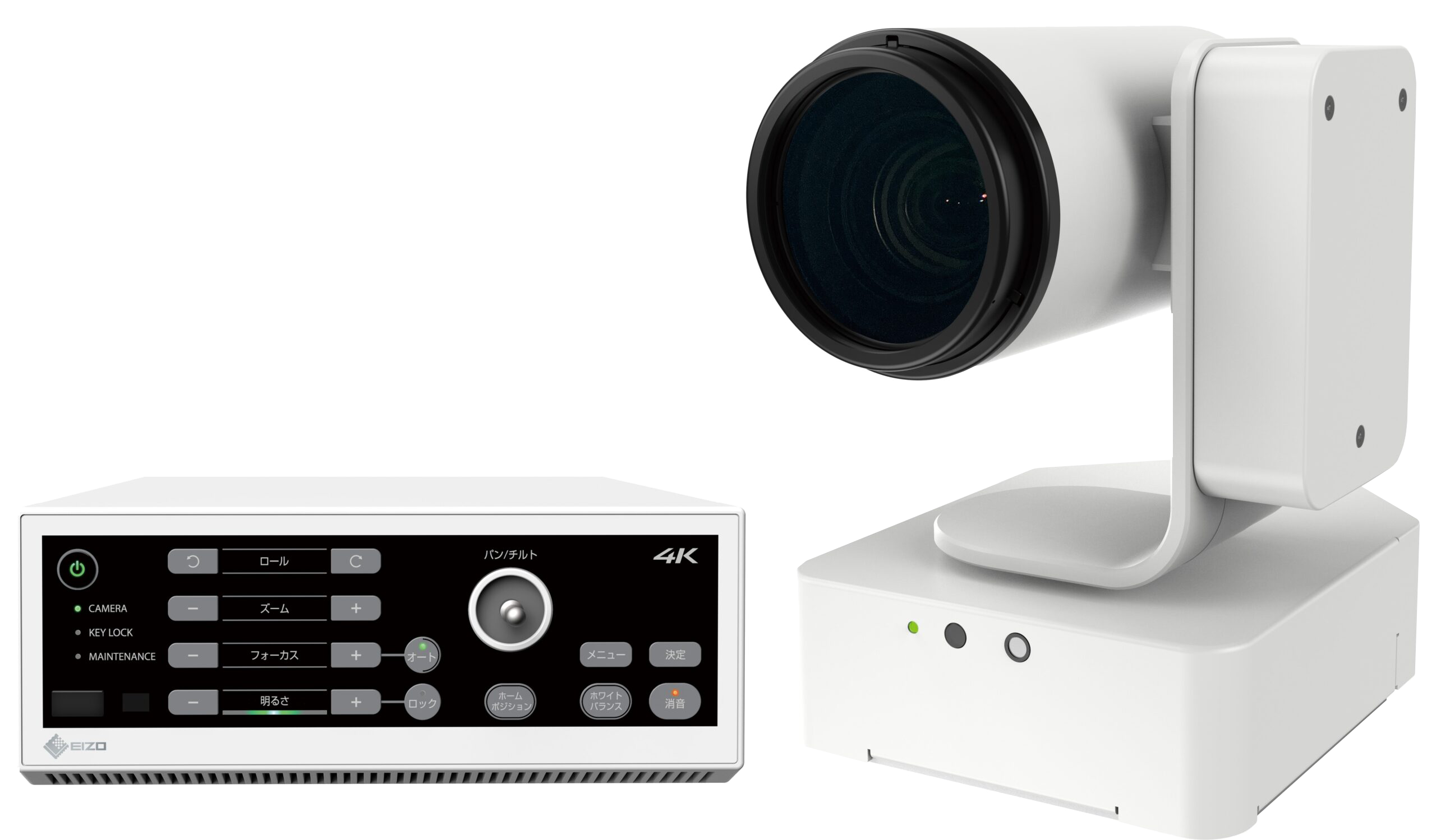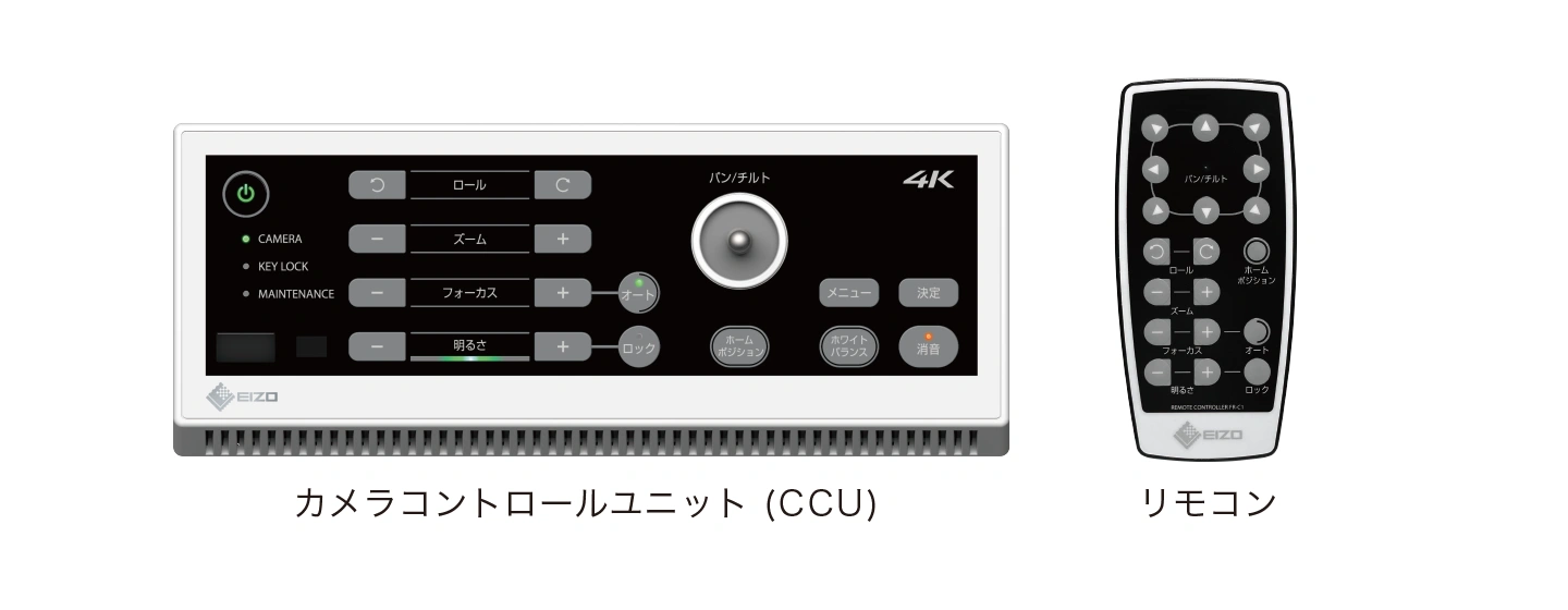 ズームやホワイトバランスなどのカメラ制御および雲台の制御は、CCU(カメラコントロールユニット)の前面パネルまたは付属の赤外線リモコンで行います。また、外部機器からイーサネットやRS-232C経由でカメラ制御が可能です。