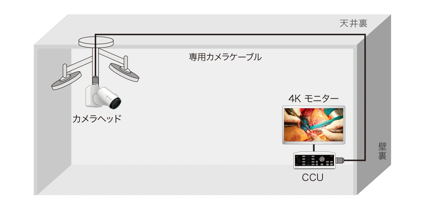 カメラヘッドとCCUは、映像、音声信号および電源供給のための専用カメラケーブル1本で接続します。これにより、設置作業が迅速かつ容易に行えます。