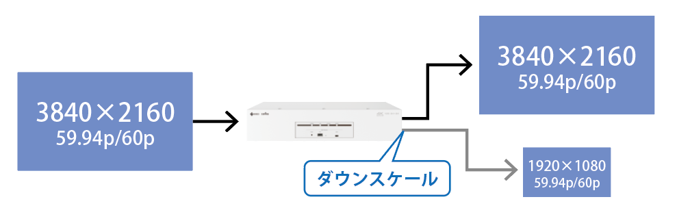 4K(3840×2160)入力信号をフルHD(1920×1080)で出力できるダウンスケール機能を搭載しています※1。出力後にコンバータを接続する必要もなく、出力端子の節約にもなります。また、DCI規格で定められている4K(4096×2160)のダウンスケール※2にも対応しています。